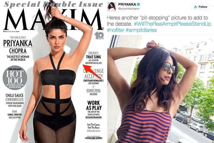 La popular actriz Priyanka Chopra saltó a la fama al ser Miss Mundo 2000 y desde entonces su carrera ha ido en ascenso. Priyanka es tan talentosa como bella y ella siempre luce increíble. A pesar de su maravillosa apariencia, ella también ha sido víctima del Photoshop y en una tapa de la revista para hombres Maxim sus axilas lucía sospechosamente lisas lo que realmente sorprendió al público. Como respuesta, ella subió una fotografía casera mostrándose completamente al natural.